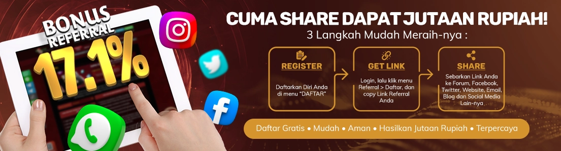 Referral system tidak dipungut biaya apapun. Hanya dengan modal online saja setelah itu Anda hanya tinggal mengecek keuntungan Anda yang dapat dilihat secara online kapanpun dan dimanapun. Register sekarang juga dan referensikan Link Referral Anda